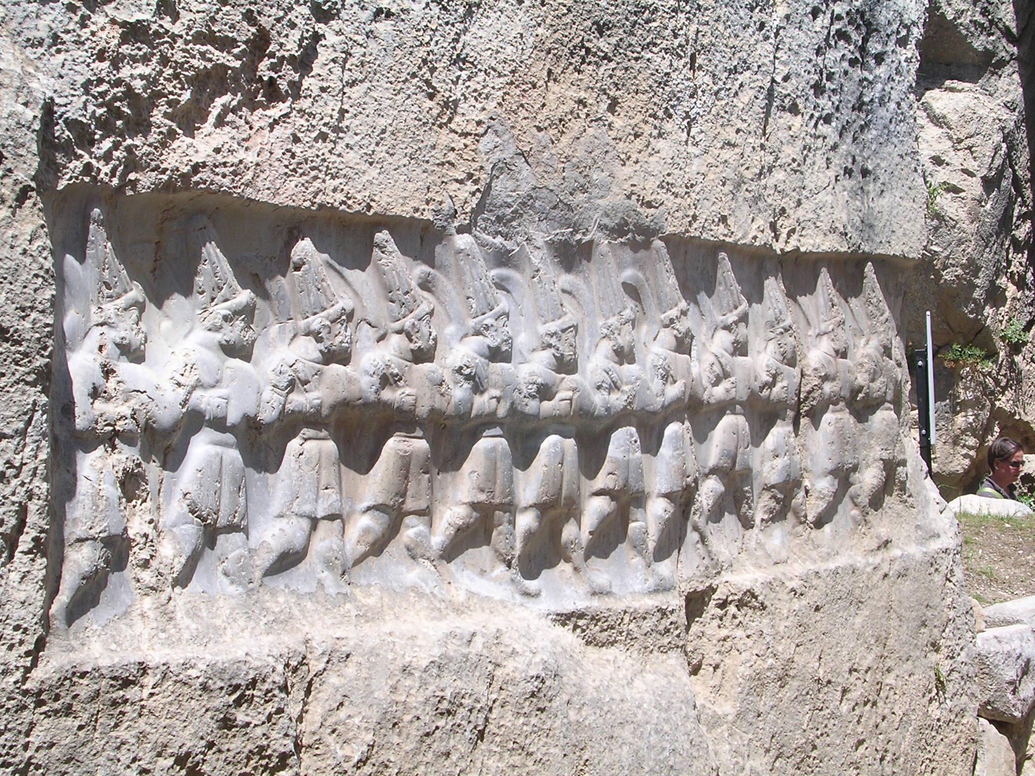Çorum Hattuşa- Bektaşi külahlı, küpeli ve kılıçlı on iki er donunda tanrı kabartması.İnsan boyunu aşan figürler güneşten gelen ışık seli ve yaşam dalgası imgesindedir.
